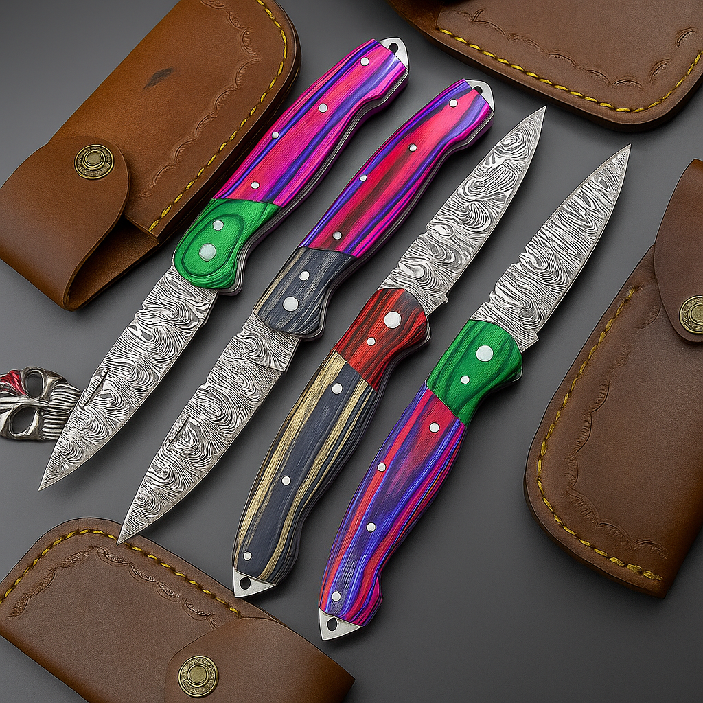 This 4-piece handmade Damascus pocket knife set is a true display of craftsmanship. Each knife features a beautifully layered Damascus blade, a vibrant multicolor wood handle, and a simple, non-locking folding design ideal for collectors and everyday carry.
