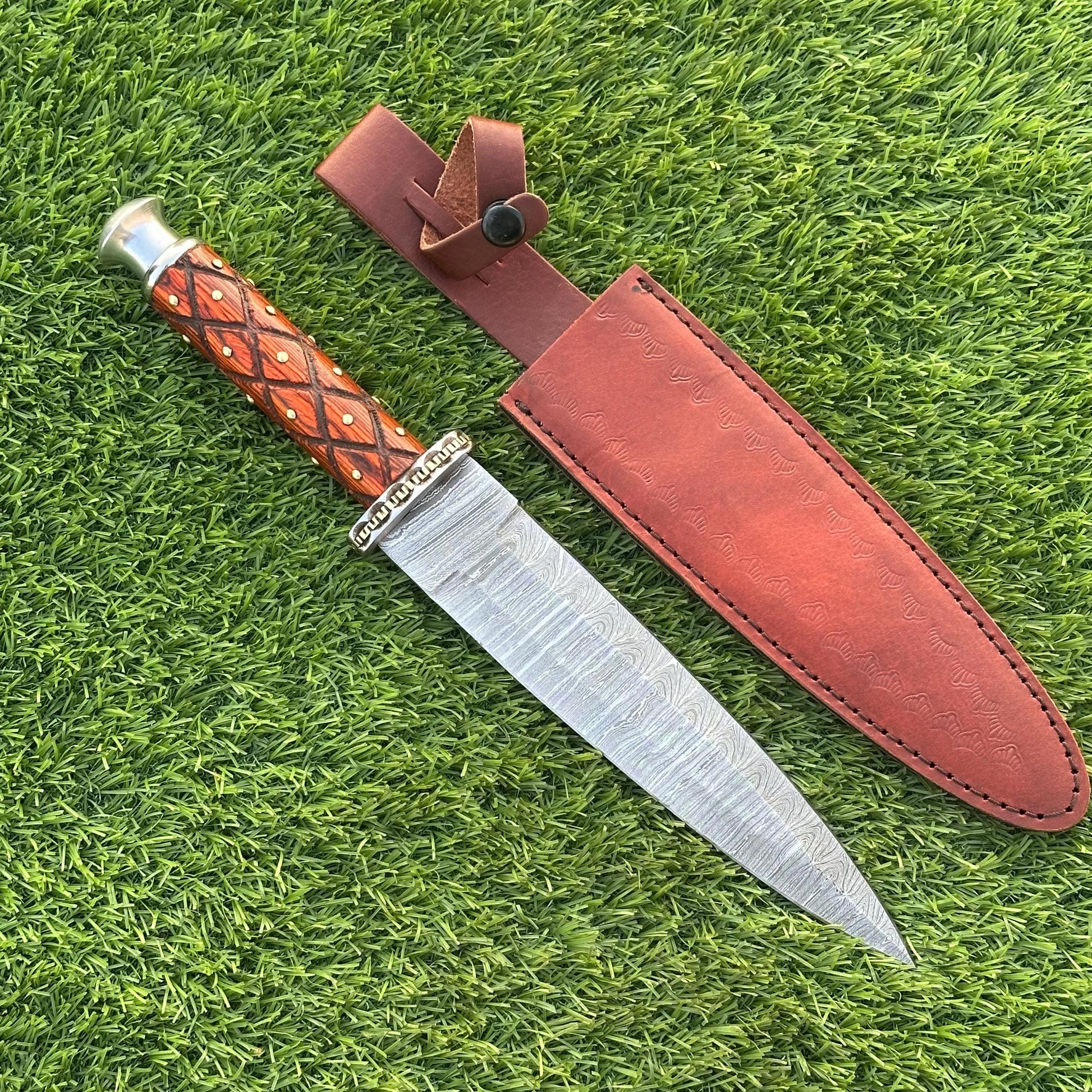 Handcrafted 14" Damascus Dagger Knife – Hardwood Handle & Leather Sheath – Hunting & Collectible Knife