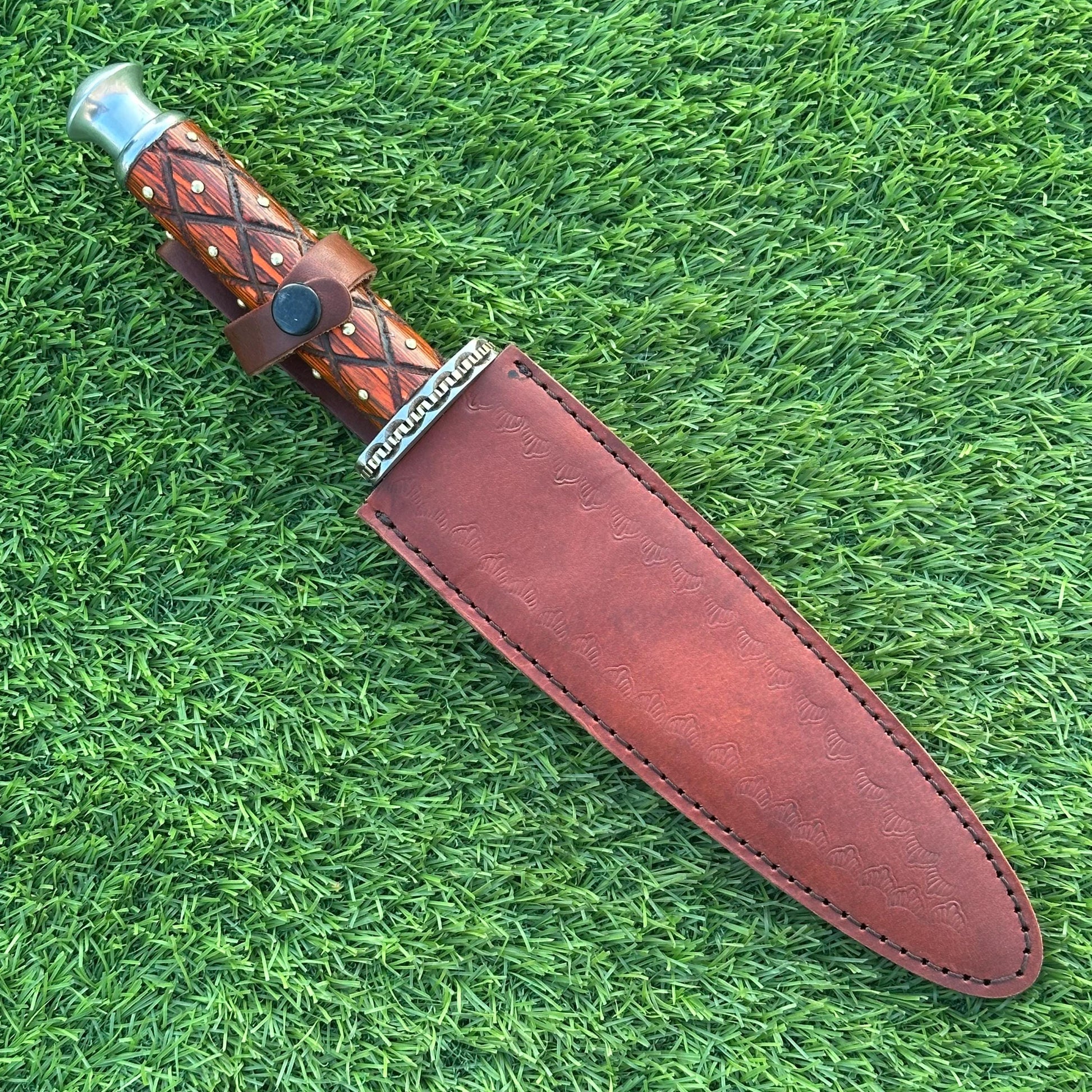 The handle is made from premium hardwood, ensuring a comfortable and secure grip. With a stunning hand-engraved design, this knife stands out as a unique piece of craftsmanship. It comes with a custom leather sheath for safe storage and easy carrying.