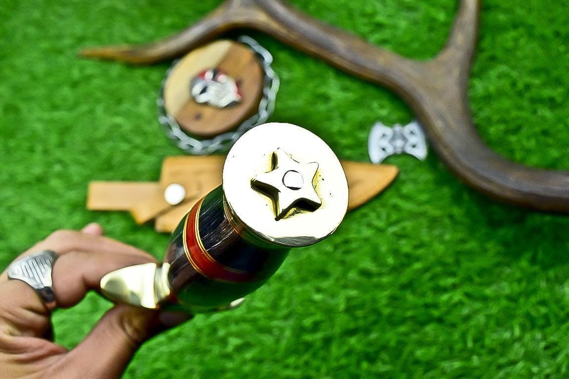 Crafted from high-quality J2 tool steel, the blade offers superior edge retention and corrosion resistance, ideal for both display and practical use. The sturdy Hard wood handle provides a comfortable grip and unique natural grain, enhancing control and aesthetic appeal. Each knife comes with a custom-fitted sheath for safe storage and transport. Key features include: