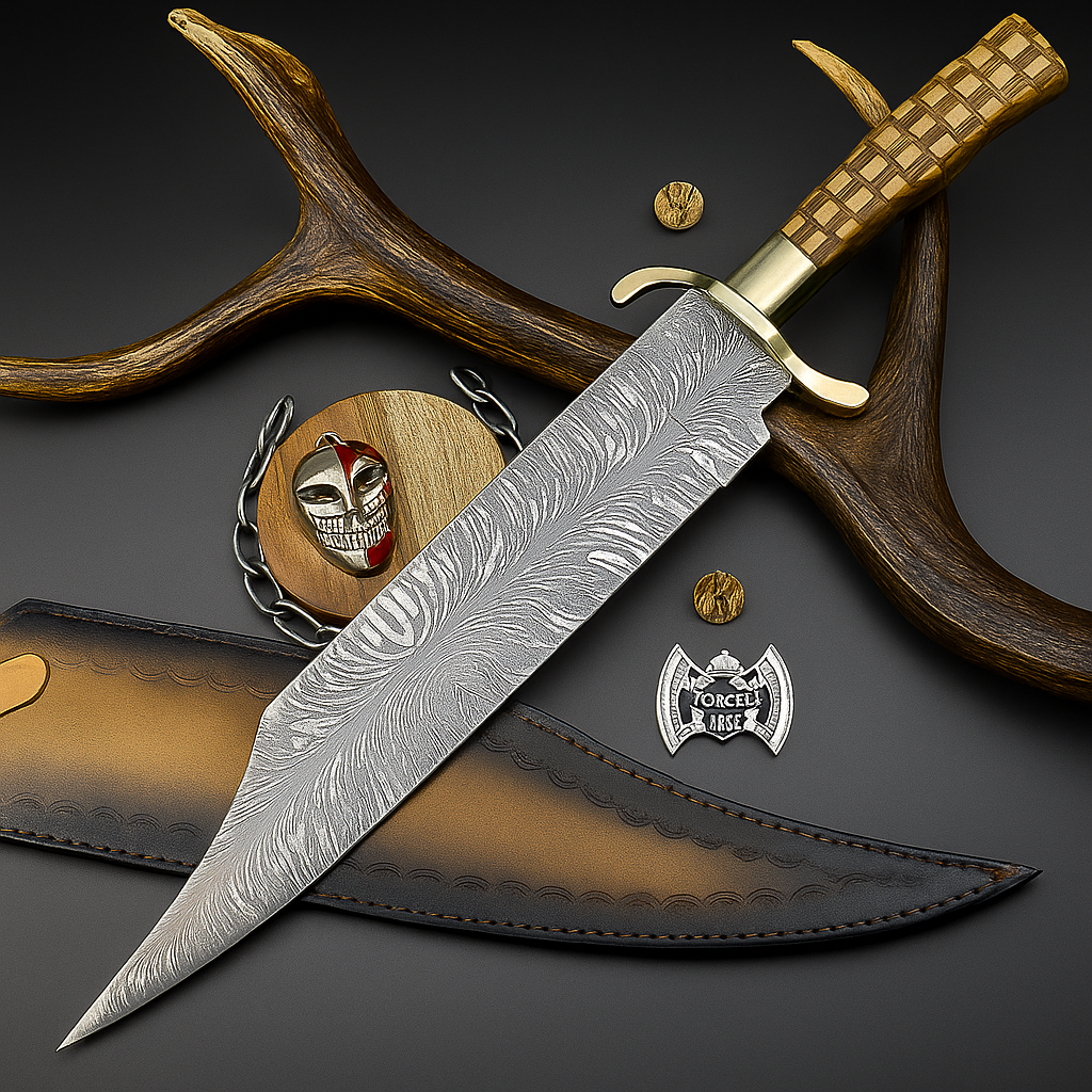 A Perfect Companion: Compact Damascus Steel Knife Crafted for both functionality and portability, this compact fixed blade knife is an ideal choice for everyday carry, bushcraft, or as a reliable hunting accessory. The blade is hand-forged from Damascus steel, featuring a captivating wave-like pattern that speaks to the quality and durability of the steel. The full tang construction ensures the blade is exceptionally strong and balanced for all your tasks. The handle is a stunning piece of genuine bone, providing a comfortable and secure grip that molds to your hand over time. The handle is accented with colored rings and a unique star-shaped pommel, adding a distinctive flair to the design. This knife is a perfect blend of rugged utility and elegant style. It comes with a durable, custom-fitted leather sheath for safe and convenient carrying.