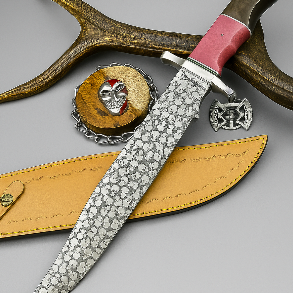 Unleash your inner warrior with this one-of-a-kind custom Bowie knife. This exceptional piece features a stunning hand-forged Damascus steel blade, masterfully engraved with a bold, repeating skull pattern that is sure to turn heads. The intricate Damascus pattern is a result of a meticulous layering and folding process, creating a blade that is not only visually striking but also incredibly durable with superior edge retention.