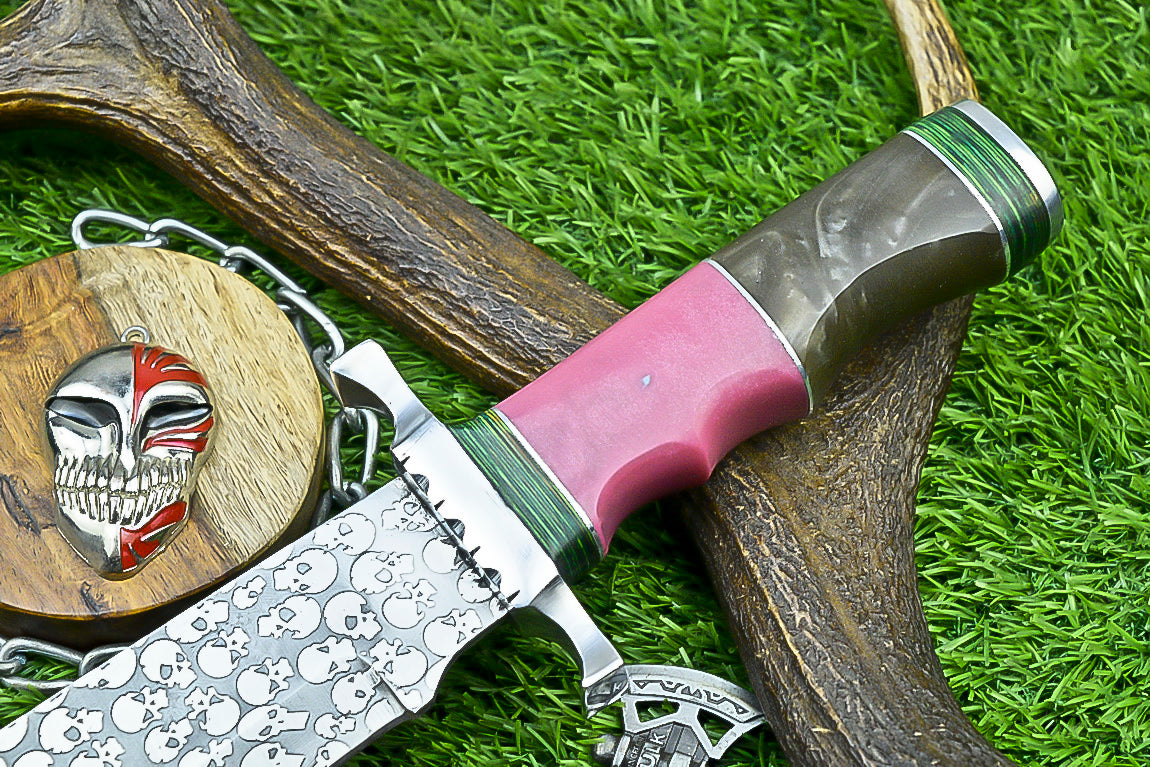 Custom Damascus Steel Bowie Knife with Skull Engraved Blade and Two-Tone Resin Handle | UN-8176