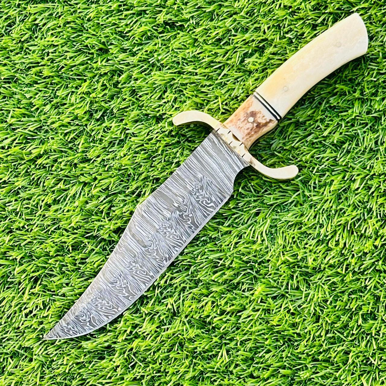 Handmade 12" Damascus Steel Hunting Knife Bowie Knife– Stag Horn & Camel bone Handle, Gift for Him, Gift for Husband, Gift for Boyfriend