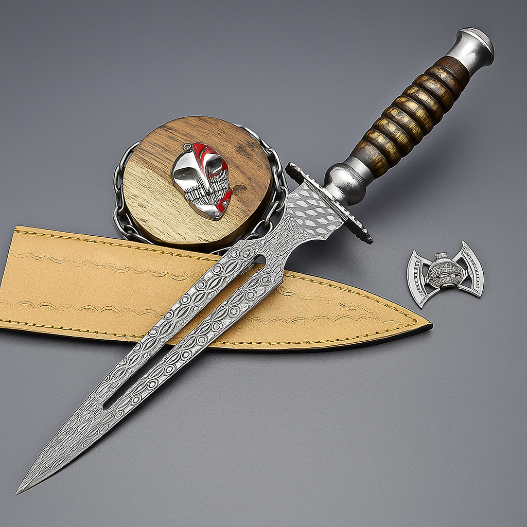 This fantasy-inspired dagger comes complete with a custom-fit, heavy-duty leather sheath, meticulously crafted to protect the blade and ensure safe carrying. As a special bonus for fans of the iconic anime, it includes a detailed Bleach Mask keychain and a miniature axe charm, making it a perfect collector's item or a unique gift.