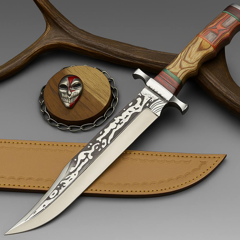 This isn't just a knife—it's a masterpiece of artistry and craftsmanship. Meticulously hand-forged, this custom Bowie knife features a striking Damascus steel blade with a unique acid-etched design. The blade’s intricate pattern tells a story of the thousands of layers of steel expertly folded and hammered to achieve unparalleled strength, edge retention, and beauty. The handle is a work of art in itself, crafted from a stunning mosaic of different wood and resin materials, providing a comfortable and secure grip while making a bold visual statement.