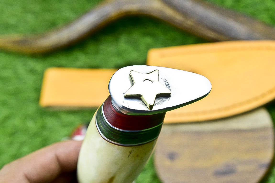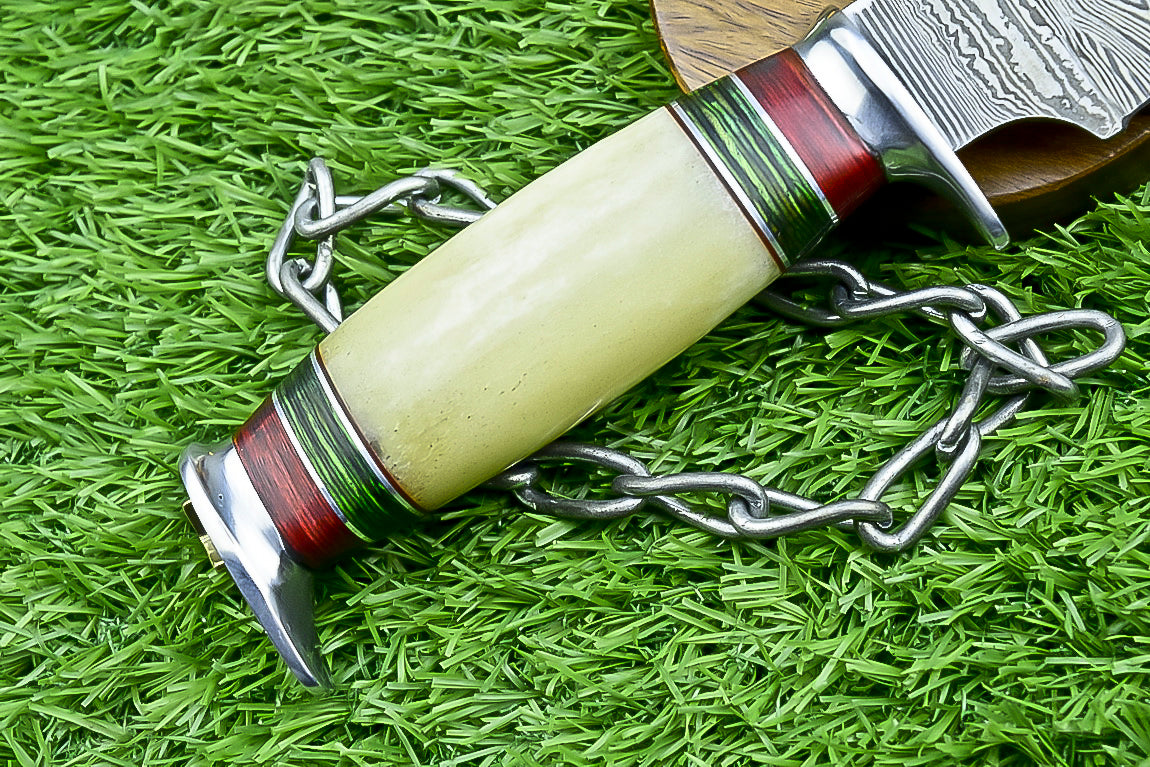 The handle is a striking composition of composite wood and vibrant resin, expertly fused to create a distinct, multicolored pattern. This artistic handle is not only visually stunning but also provides a comfortable and secure grip, making the knife a joy to handle. Ideal for collectors and enthusiasts who value a blade that is as unique as they are. It comes with a durable, custom-fitted leather sheath for safe transport and storage.