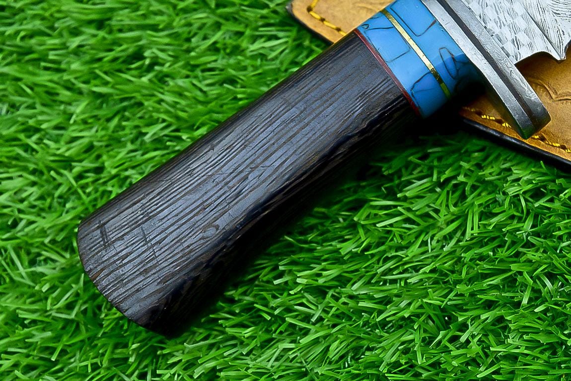 This handcrafted Damascus steel blade knife is designed for durability, sharpness, and aesthetic appeal. The resin handle provides a comfortable grip, ensuring precision and control during use. Whether you're an outdoor enthusiast, hunter, camper, or collector, this knife offers both functionality and craftsmanship.