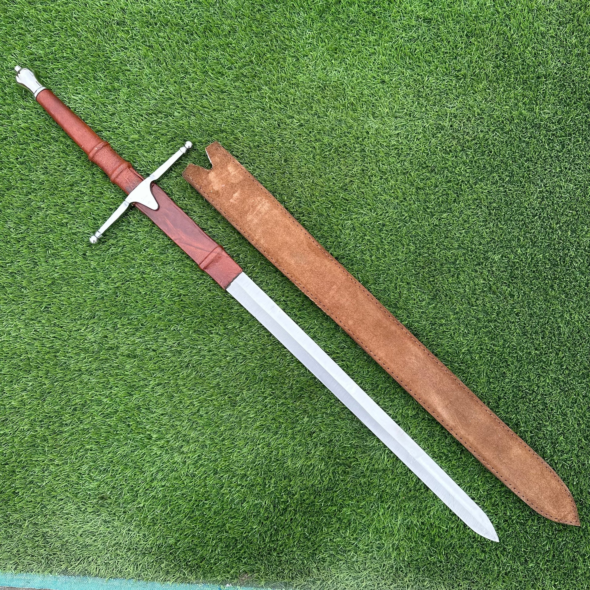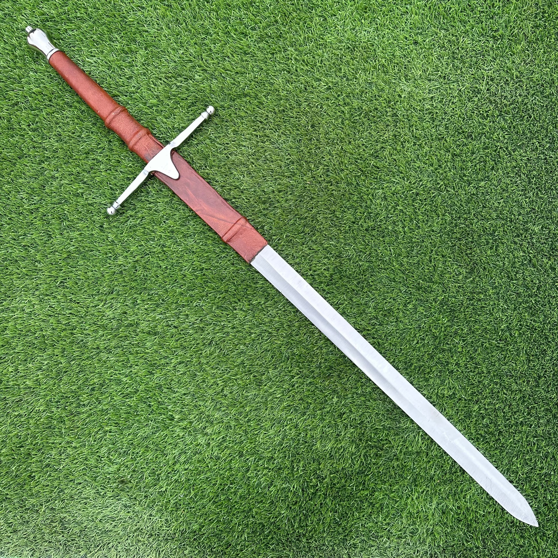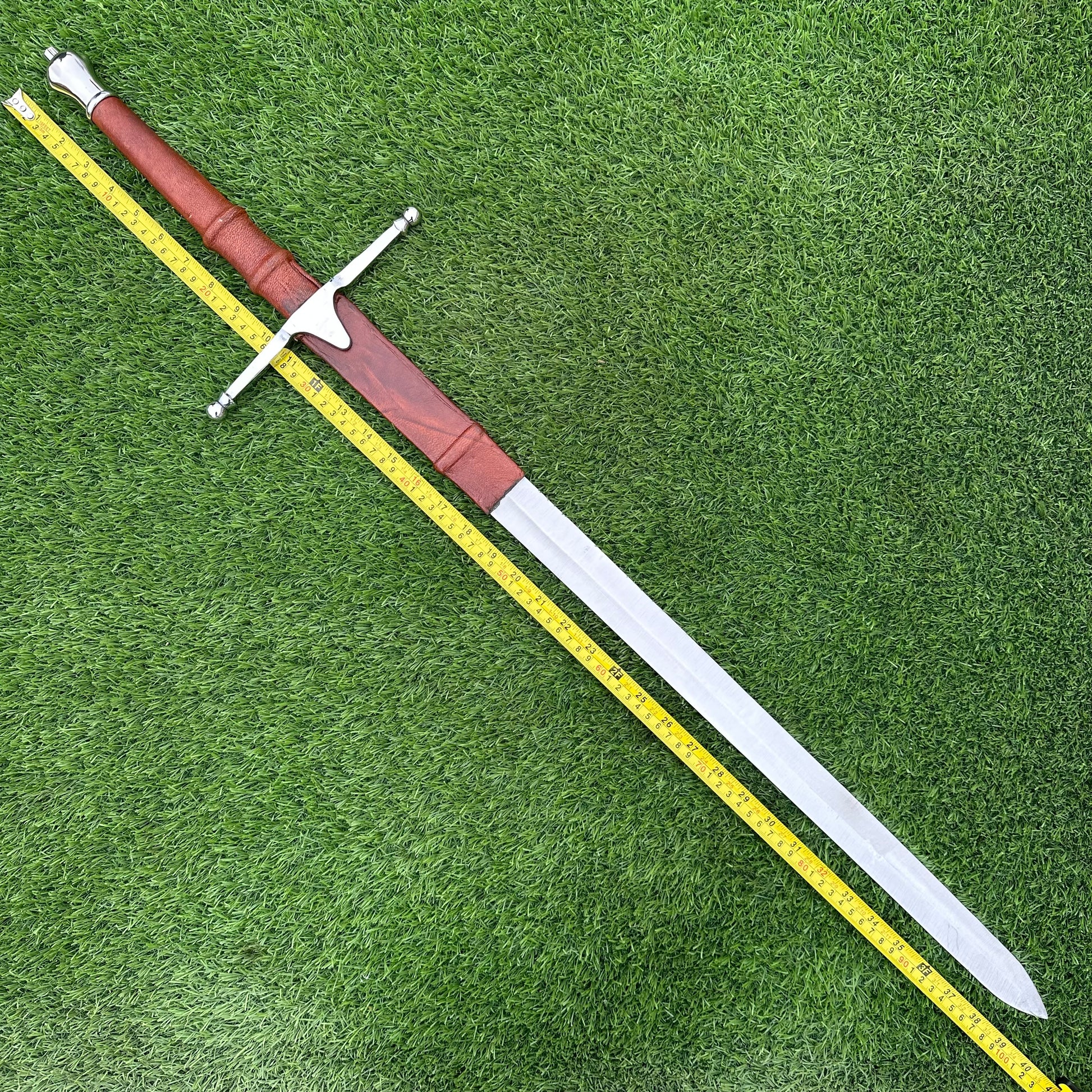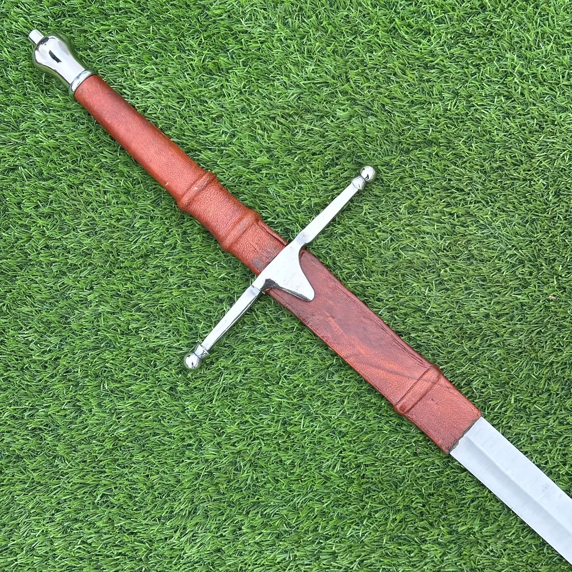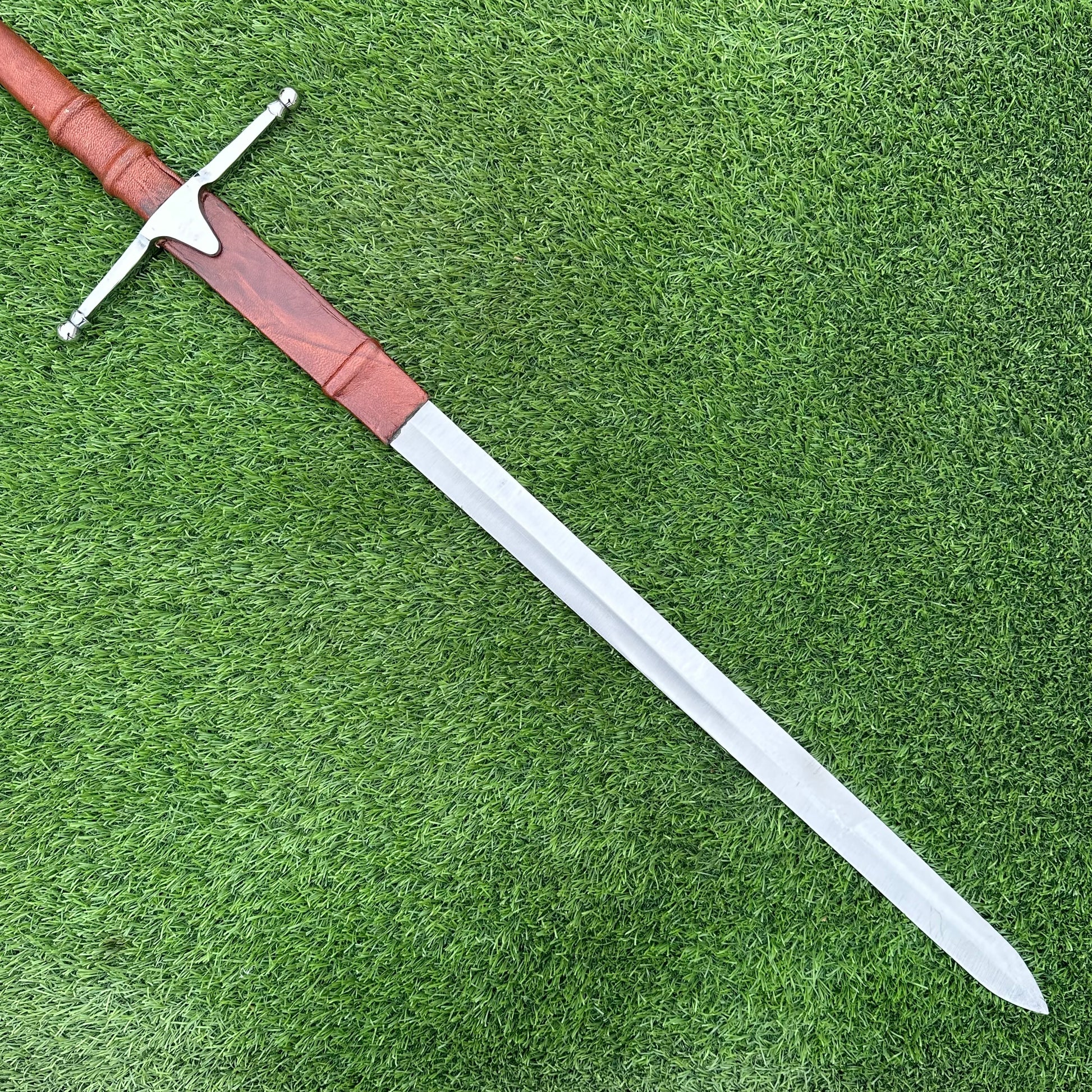 Experience the craftsmanship of a medieval-inspired design with this 39-inch handmade Scottish Claymore-style sword. Forged from polished J2 steel, this longsword delivers both beauty and durability. The handle features a silver-toned guard and pommel, wrapped in genuine leather for a comfortable and secure grip. A custom leather sheath is included for safe storage and presentation.