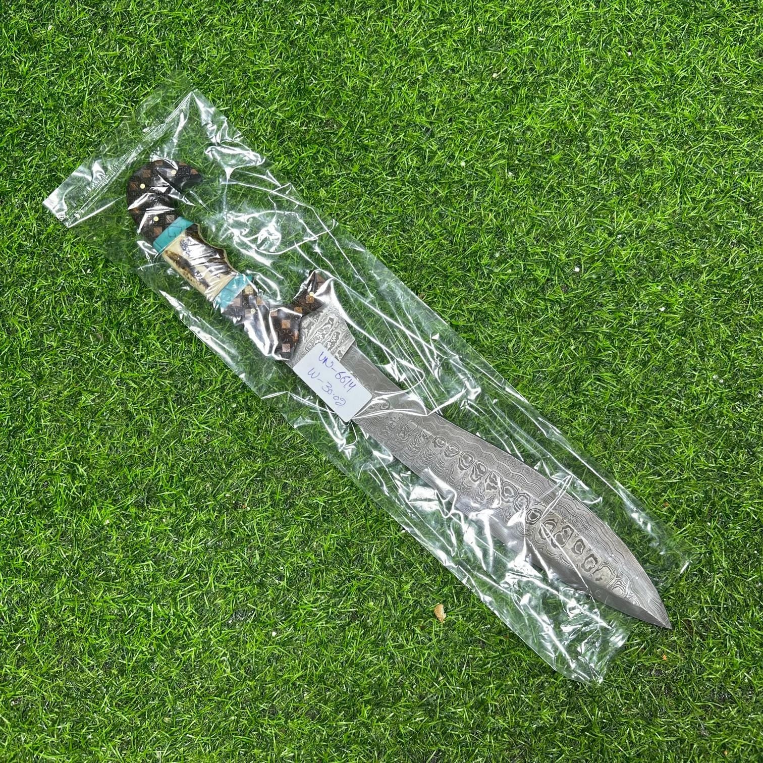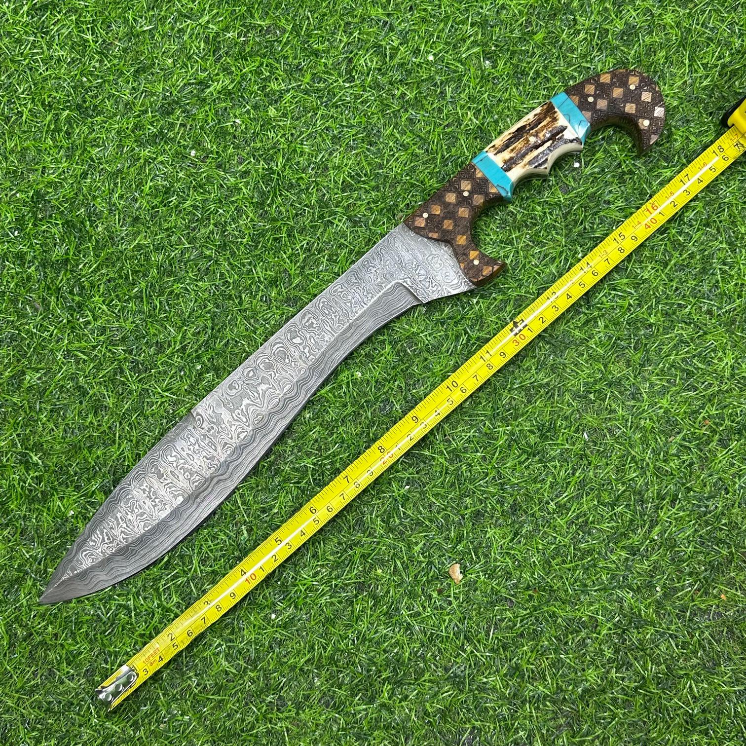 This stunning 18" handmade hunting knife combines craftsmanship with functionality, making it an excellent choice for outdoor enthusiasts, collectors, and gift-givers. The handle is a masterpiece of stag horn and wenge wood, offering an elegant yet robust grip. The Damascus steel blade ensures durability, sharpness, and a unique pattern that sets it apart.